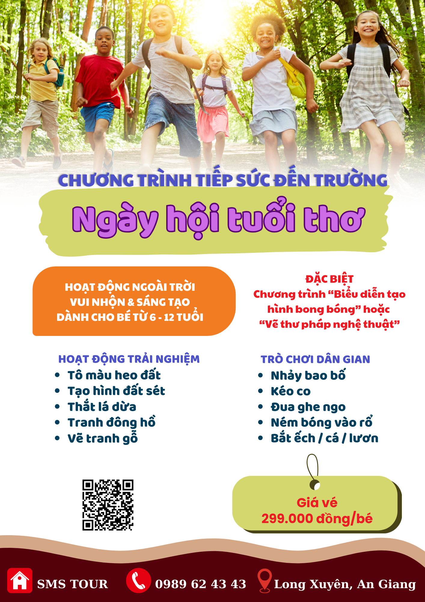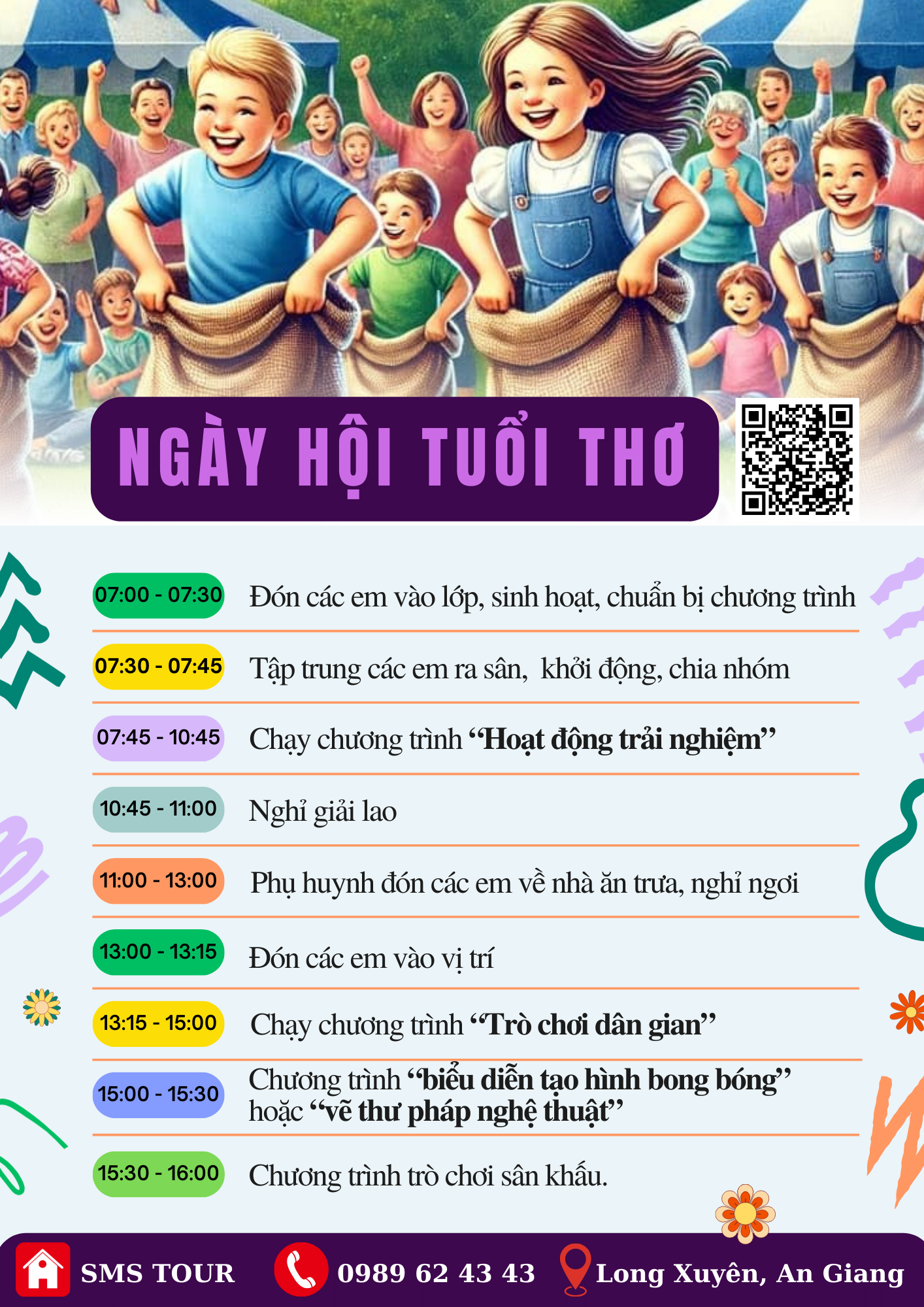 Nhằm tạo điều kiện cho các em học sinh từ 6 đến 12 tuổi có một sân chơi bổ ích, rèn luyện kỹ năng và khơi gợi sự sáng tạo, chương trình Hoạt động trải nghiệm năm nay mang đến một ngày hội đặc biệt với chủ đề “Ngày hội tuổi thơ” – một hoạt động ngoài trời đầy màu sắc, niềm vui và tiếng cười do đội ngũ SMS TOUR thực hiện.