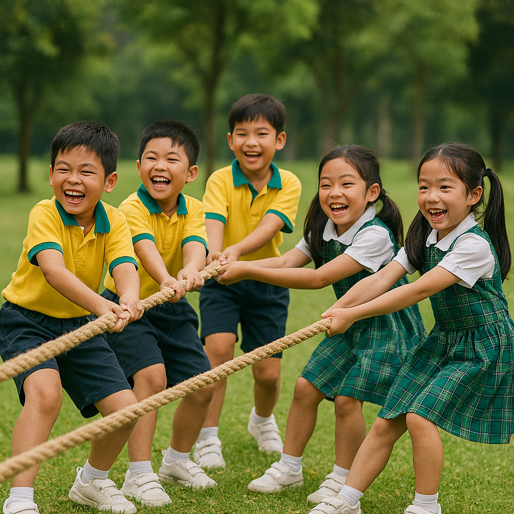 Không khí sẽ trở nên sôi động hơn với các trò chơi dân gian, giúp các em rèn luyện thể chất, tinh thần đồng đội và sự nhanh nhẹn: