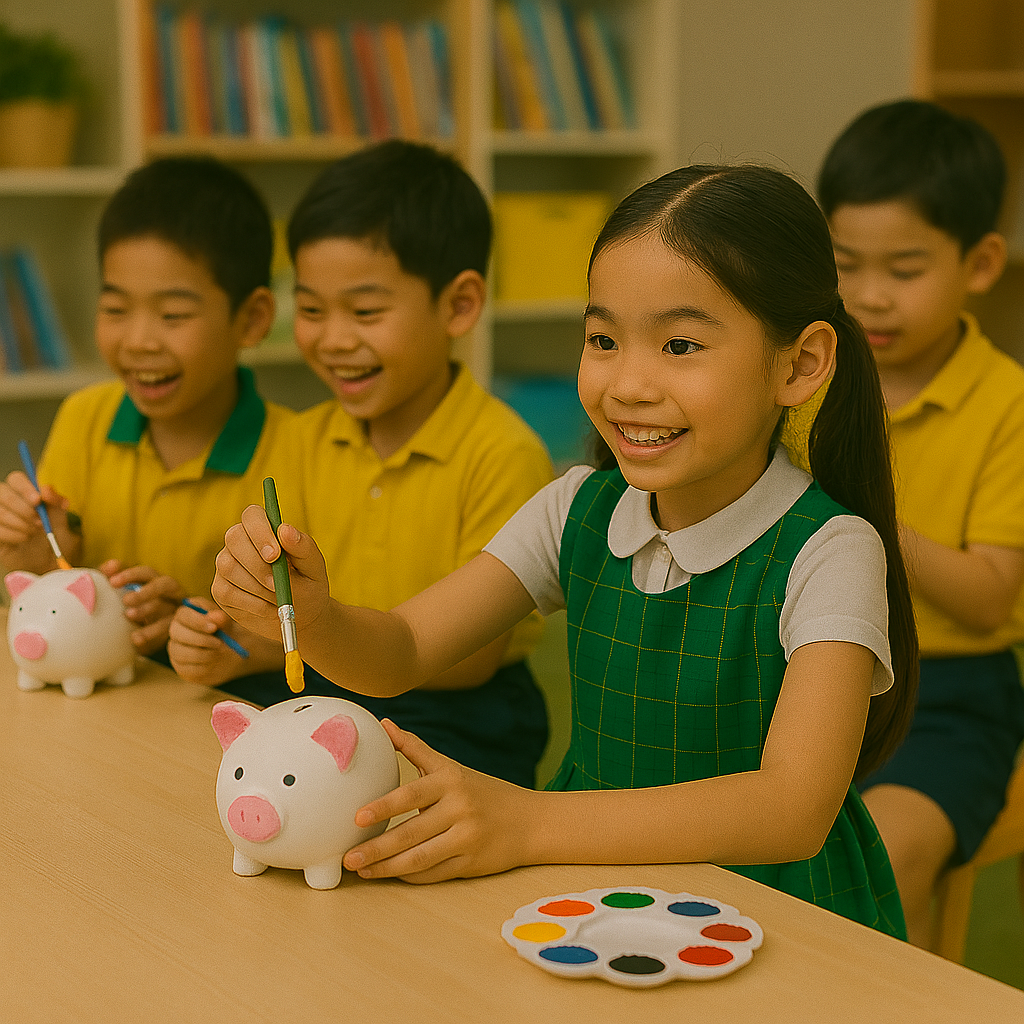 - Tô màu heo đất: Mỗi bé sẽ được tự tay tô điểm cho chú heo đất của mình, gửi gắm ước mơ và lời nhắn nhủ về tiết kiệm.