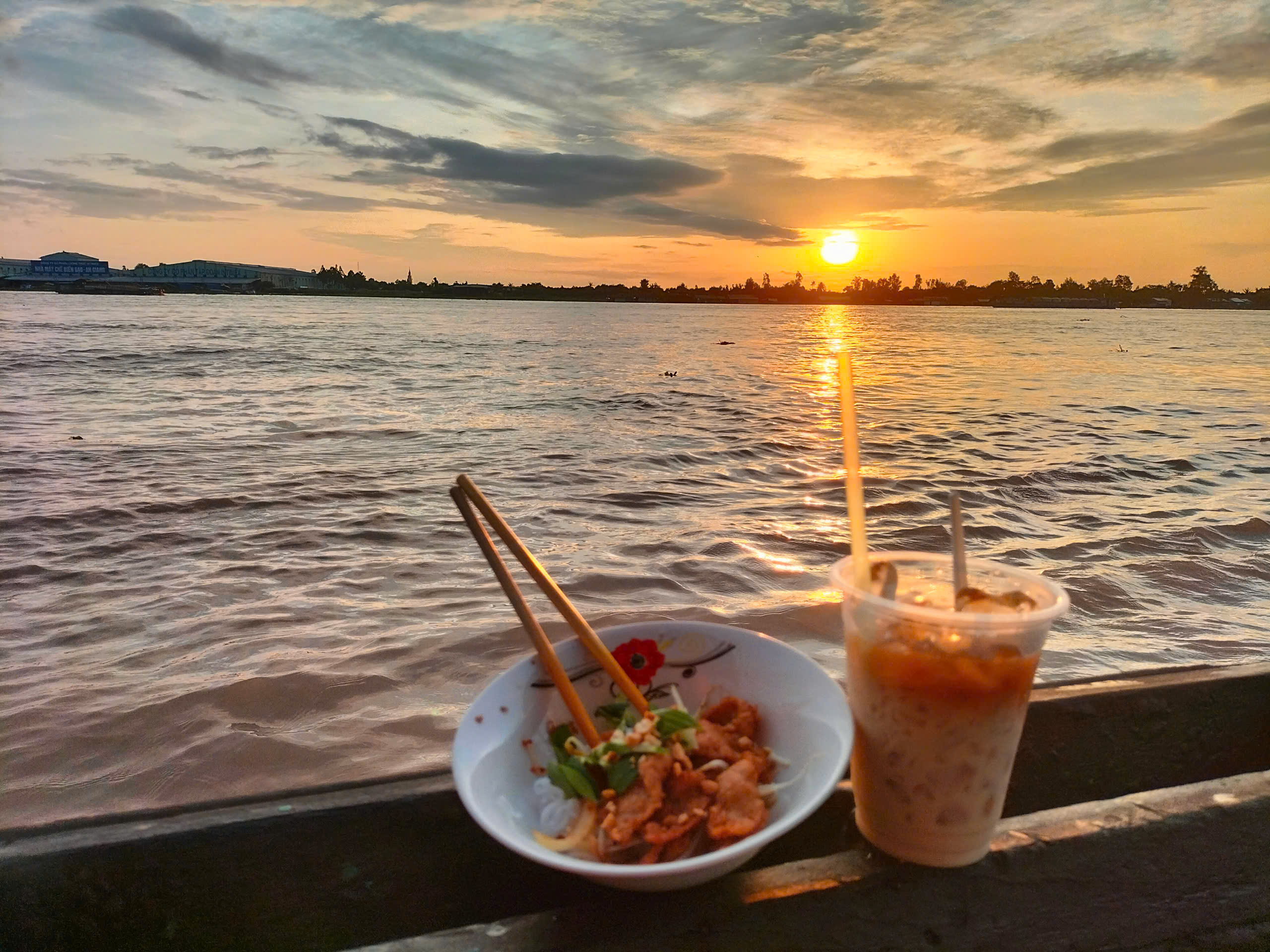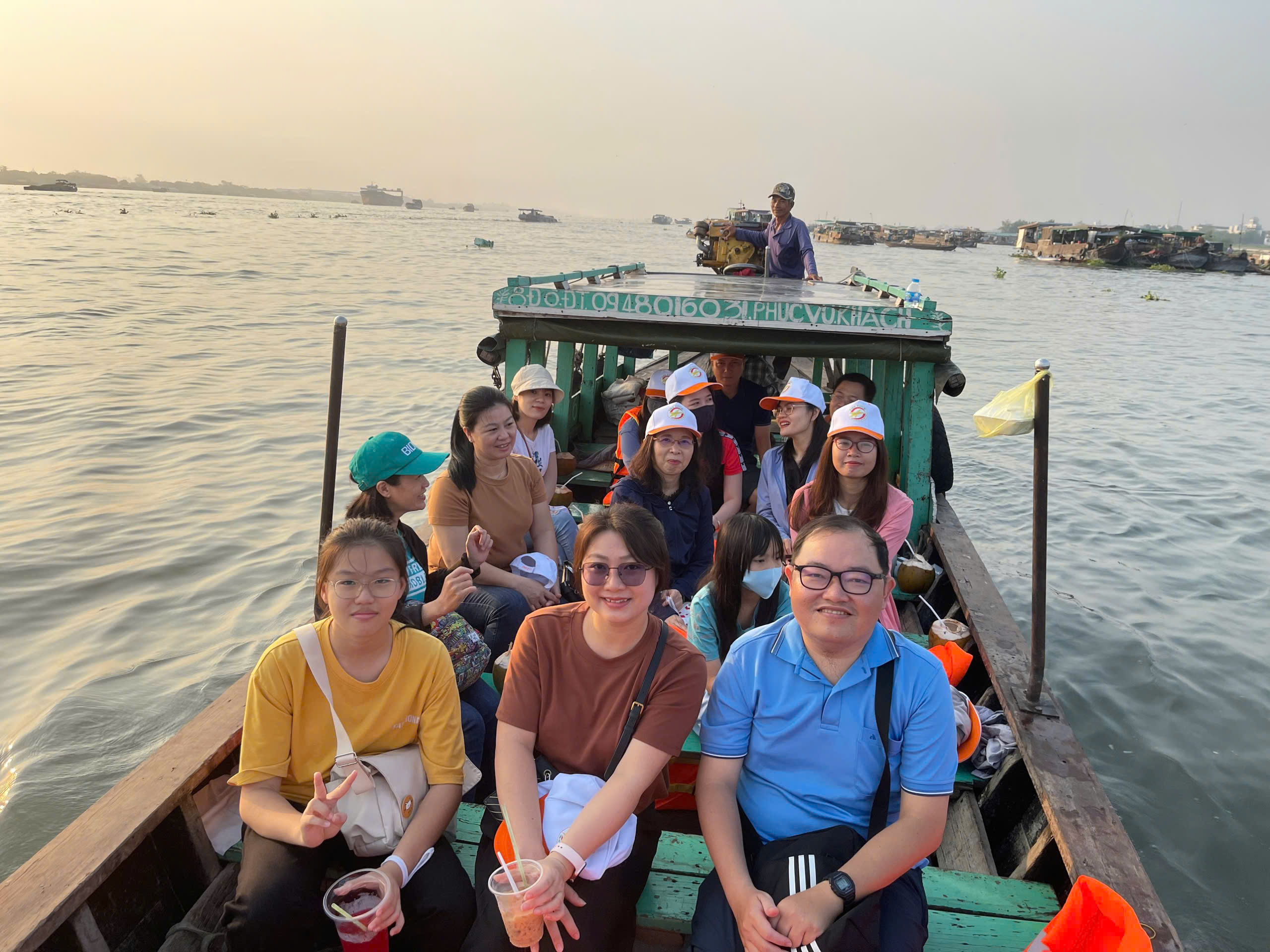 Đoàn dùng điểm tâm sáng tự túc và đón bình minh trên chợ nổi Long Xuyên